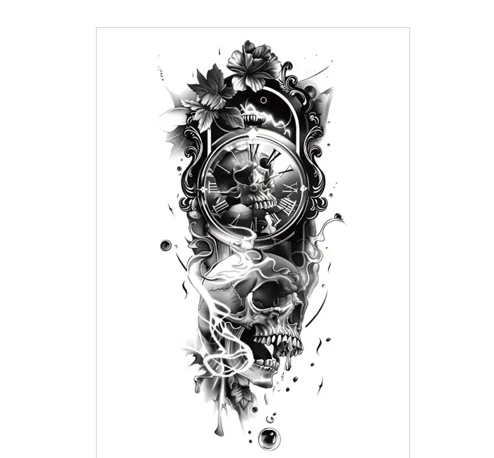 Contemplate Time with This Clock & Skull All Black Tattoo