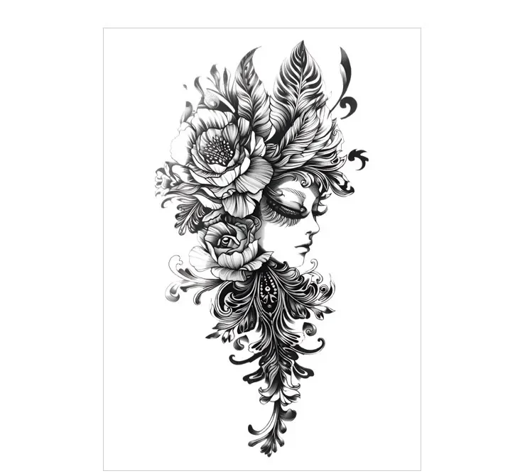 Embrace divine beauty with this elegant blackwork design. A graceful goddess figure is surrounded by blooming florals, celebrating nature and femininity. This black tattoo brings sacred beauty to your skin for 3 days. Shop more all black styles here →