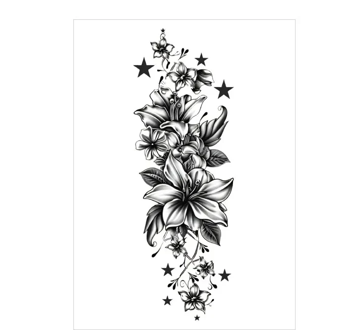Combine the purity of lilies with the magic of stars in this delicate blackwork design. Perfect for those who love nature and the cosmos, this black tattoo brings ethereal beauty to your skin for 3 days. Shop more all black styles here →