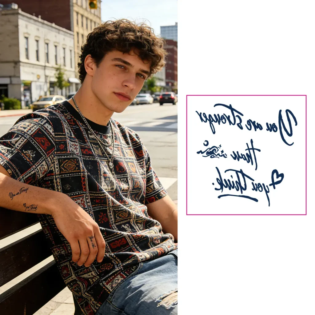 Discover hidden inspiration with our Uplifting Reversible Quote herbal tattoo. This ambigram design is among the most clever and interactive temporary tattoos. The herbal formula supports a thoughtful, long-wear temporary tattoo journey, with the design fading over 7-14 days.