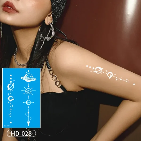 Carry the universe with you using our Celestial White Planet Trail Temporary Tattoo. This design depicts a trail of planets and celestial bodies in elegant white, perfect for astronomy lovers and dreamers. It’s a cosmic body tattoo sticker that lets you wear the wonders of space on your skin for 3 days. Discover more trendy styles here →