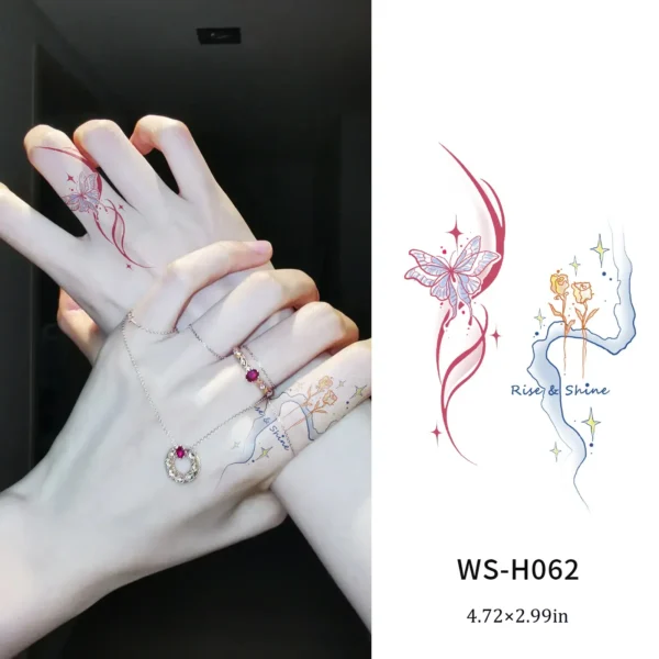 Embrace a daily dose of hope and transformation with our Rise & Shine Butterfly Finger Tattoo Sticker. This charming design features a delicate butterfly paired with the uplifting words “Rise & Shine,” creating a perfect small and meaningful  tattoo for your fingers, hand, or wrist. It’s a subtle yet powerful reminder to begin anew, worn as a beautiful accessory that lasts 3-7 days.