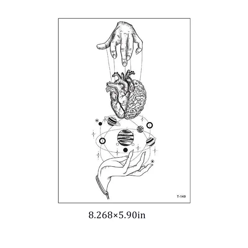Confront the complexities of inner conflict with our Mind & Heart Puppeteer Temporary Tattoo. This evocative design, depicting a hand manipulating marionette strings attached to both a brain and a heart, is a quintessential piece of philosophical dark tattoo imagery. It’s designed for those who appreciate body art that explores deeper themes of control, emotion, and thought, lasting as a striking statement for 3-7 days.