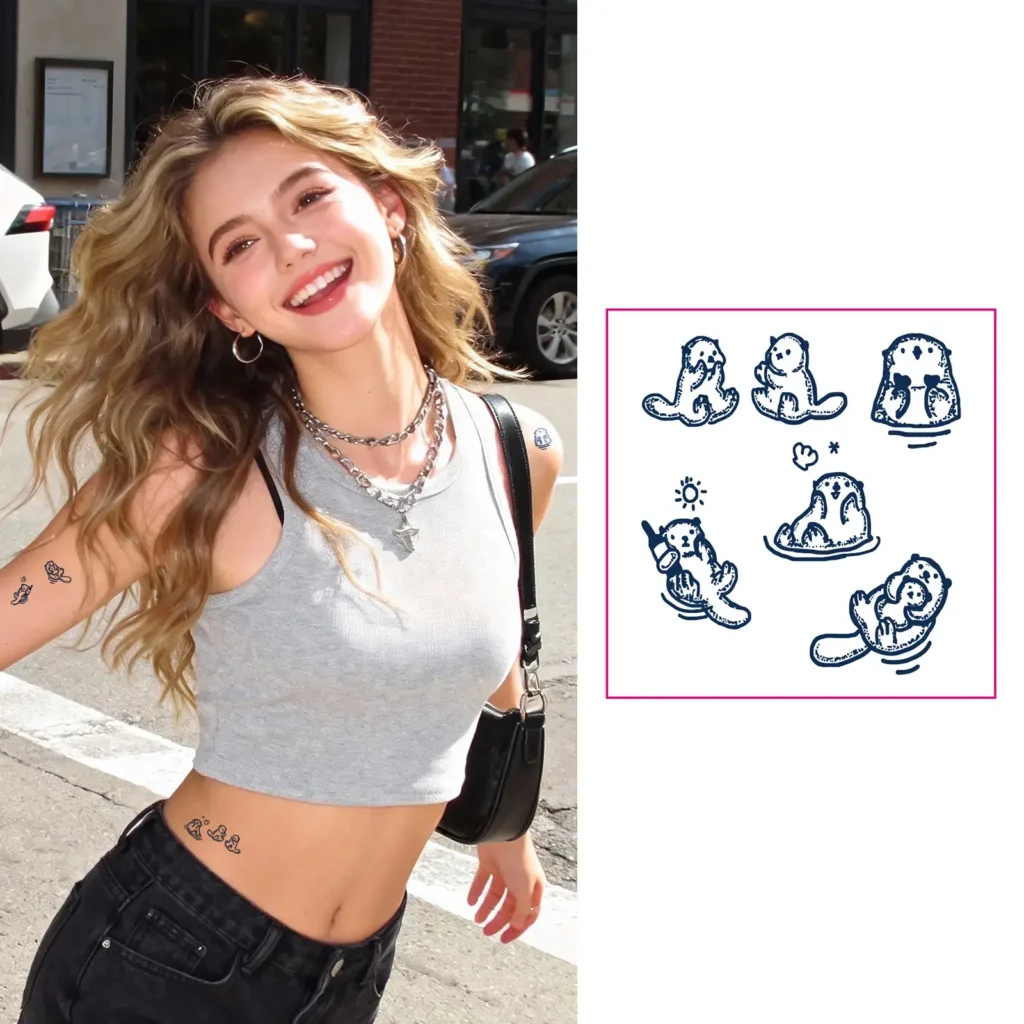 Showcase your love for playful creatures with our Cute Otter Doodle herbal tattoo set. These charming illustrations are perfect cute and collectible tattoos. As gentle herbal tattoos, they offer extended wear, fading naturally over 7-14 days.