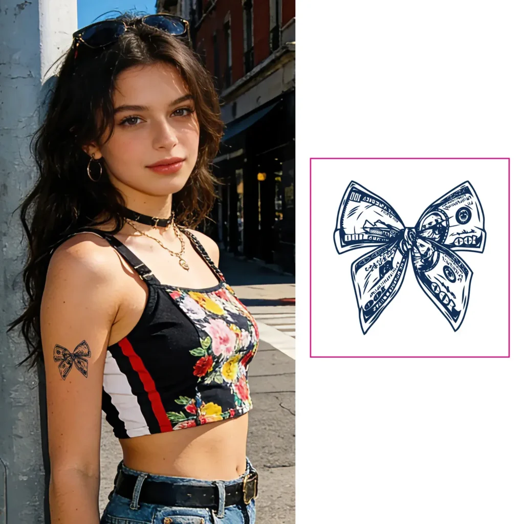 Merge streetwise edge with a luxe twist using our Edgy Cash Bow herbal tattoo. This design is a confident and eye-catching tattoo. Experience it as a vibrant, long-lasting tattoo that holds its bold statement for 7-14 days.