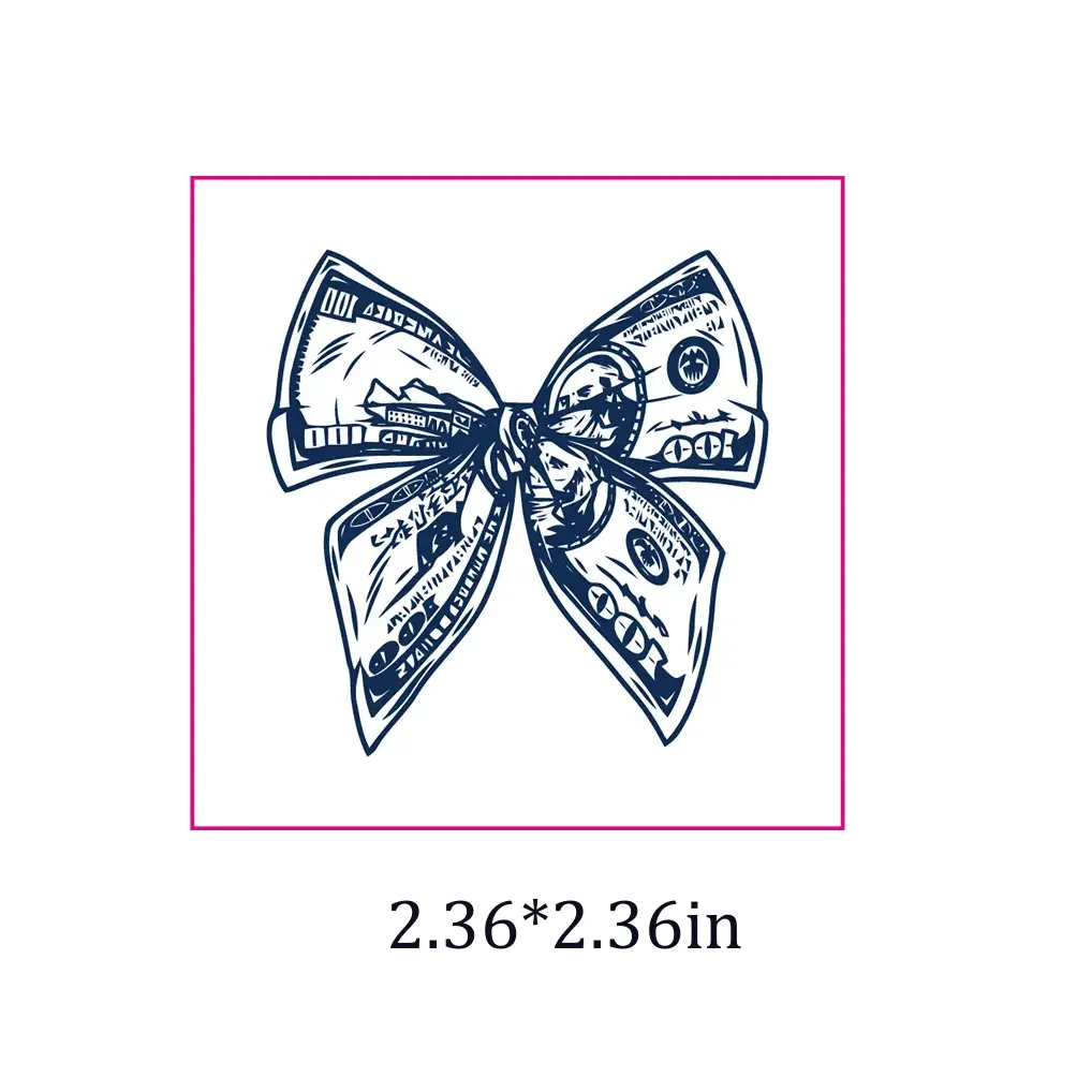 Merge streetwise edge with a luxe twist using our Edgy Cash Bow herbal tattoo. This design is a confident and eye-catching tattoo. Experience it as a vibrant, long-lasting tattoo that holds its bold statement for 7-14 days.