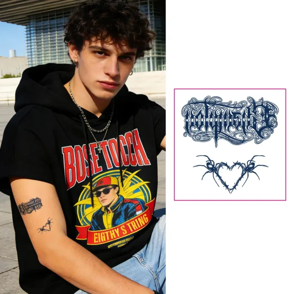 Channel dark romance with our Gothic Script & Spider Heart herbal tattoo. This design merges ornate lettering with a symbolic spider heart for a striking and convincing fake tattoo. Made with a plant-based formula, it offers a long-lasting realistic tattoo experience, naturally fading over 7-14 days like a real tattoo heals.