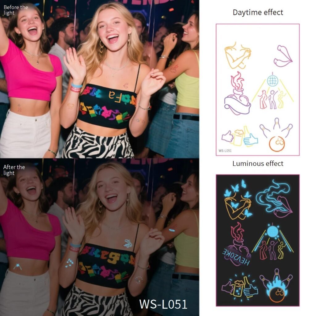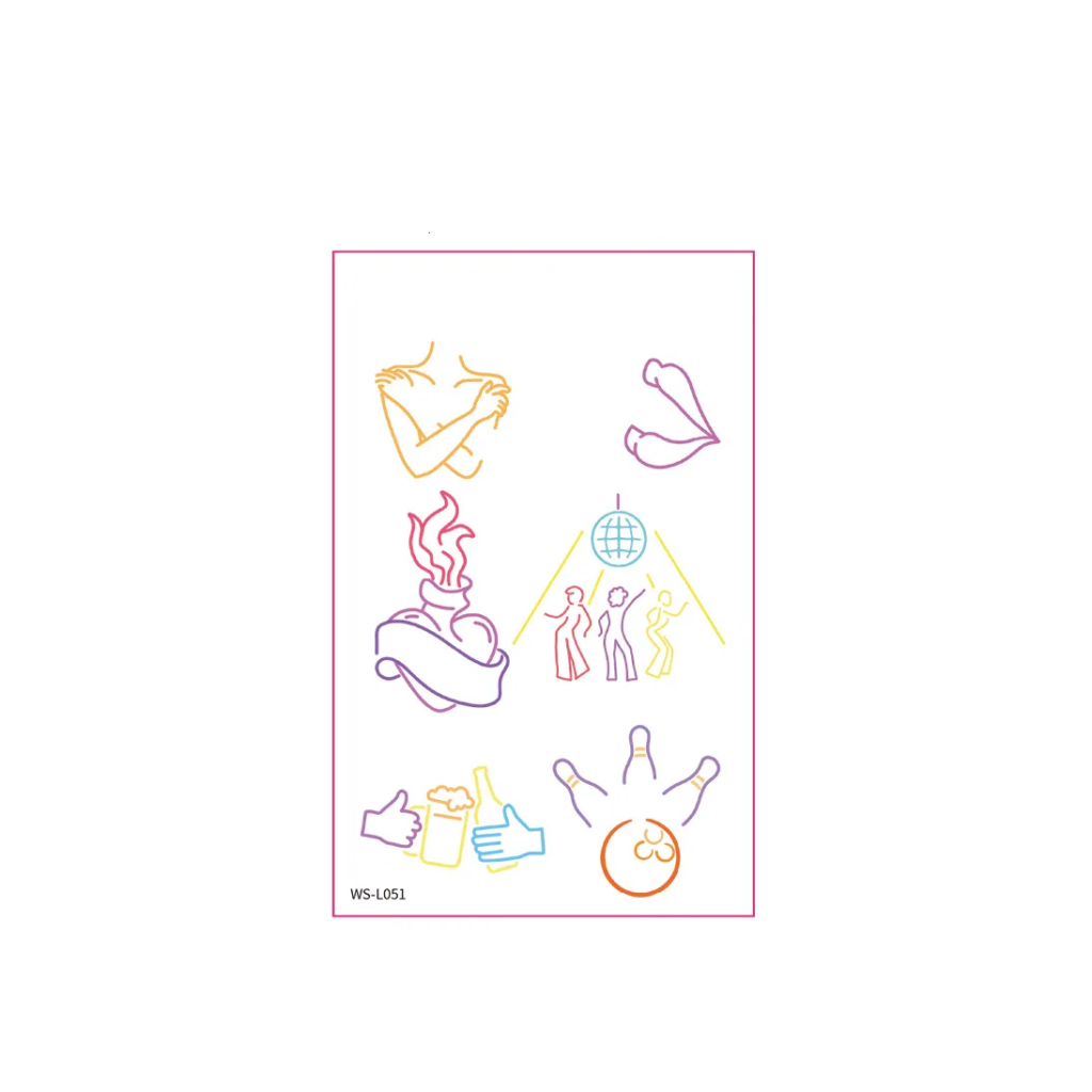 Stayin’ alive never looked so bright with our Disco Fever glow tattoo. This groovy design transforms into a sparkling disco tattoo under lights. Essential for retro parties, this 70s tattoo keeps the groove for 3 nights.