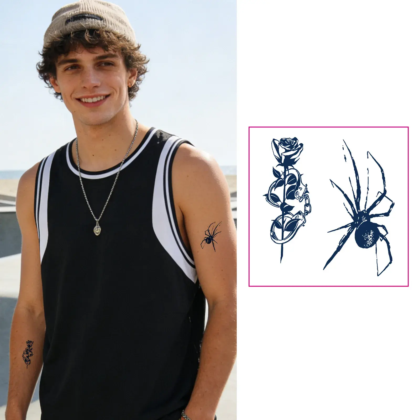 Merge beauty with rebellion using our Edgy Rose & Spider Silhouette herbal tattoo. This stark, high-contrast design is a bold and alternative long lasting temporary tattoo. The herbal base provides a vivid, extended-wear temporary tattoo that holds its powerful look for 7-14 days.