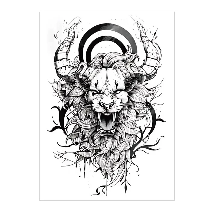Mythical Edge: The horned lion brings dark fantasy to life in these realistic tattoo stickers.