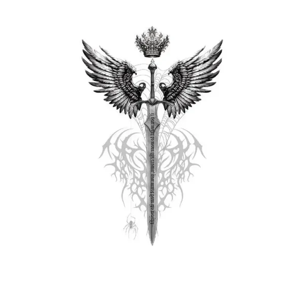 Command attention with our Sacred Sword with Wings & Crown tattoo sticker, a masterpiece in the world of realistic temporary tattoos. This design combines the power of a medieval sword, the grace of angelic wings, and the authority of a crown into one stunning, 3D-effect piece. It’s the perfect way to experience the depth and detail of high-detail, realistic tattoo art for 3-7 days with no permanent commitment.