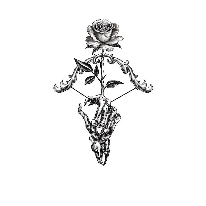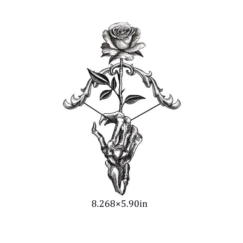 Unveil a classic symbol with a dark twist. Our Monochrome Gothic Rose & Skeleton Hand temporary tattoo reimagines the timeless tattoo with haunting elegance. This striking design contrasts the beauty of a full-bloom rose with the starkness of a skeletal hand, creating a perfect piece for lovers of dark and symbolic tattoo designs that require no permanent commitment.