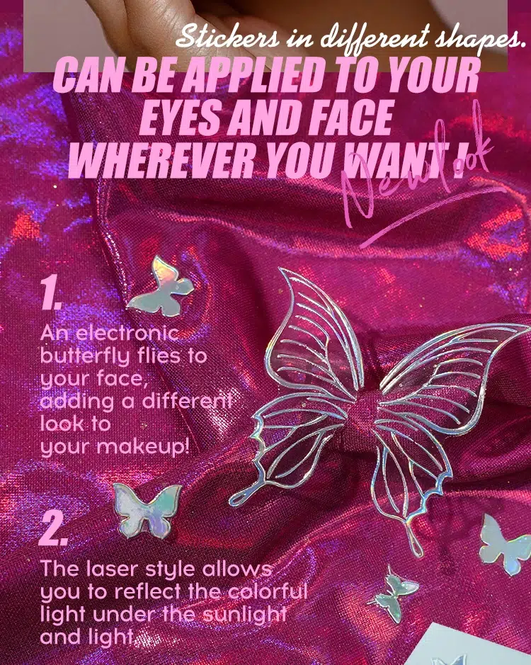feature a stunning Laser Butterfly and a bold Flame Flash design. These are brilliant easy-to-use self-adhesive face decoration stickers designed to transform your face and body into a sparkling canvas for parties, festivals, or photoshoots.