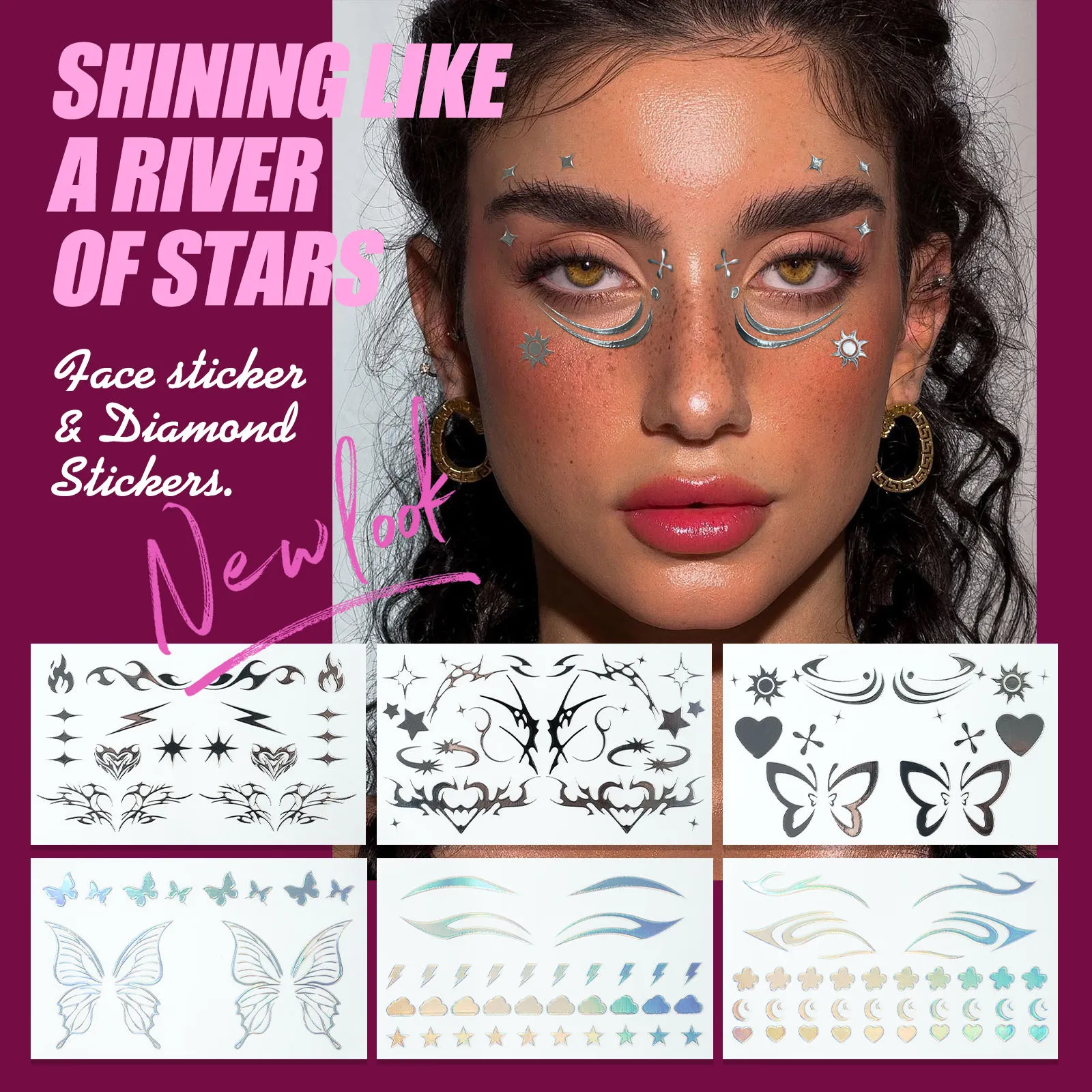 feature a stunning Laser Butterfly and a bold Flame Flash design. These are brilliant easy-to-use self-adhesive face decoration stickers designed to transform your face and body into a sparkling canvas for parties, festivals, or photoshoots.