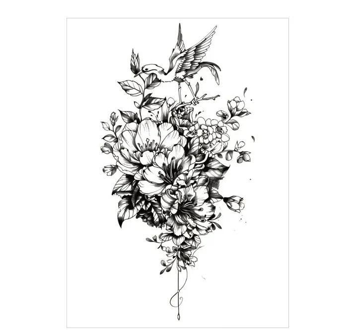 Let your spirit take flight with our Monochrome Floral & Bird Temporary Tattoo. This graceful design features a delicate bird among blooming flowers, capturing the essence of nature through elegant stickers tattoo. This peaceful design brings tranquility to your skin for 3 days. Explore more stickers tattoo styles here →