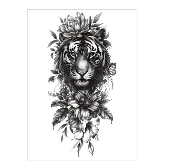Unleash Strength Surrounded by Beauty with This Tiger Stickers Tattoo StyleMonochrome Tiger & Floral Temporary Tattoo