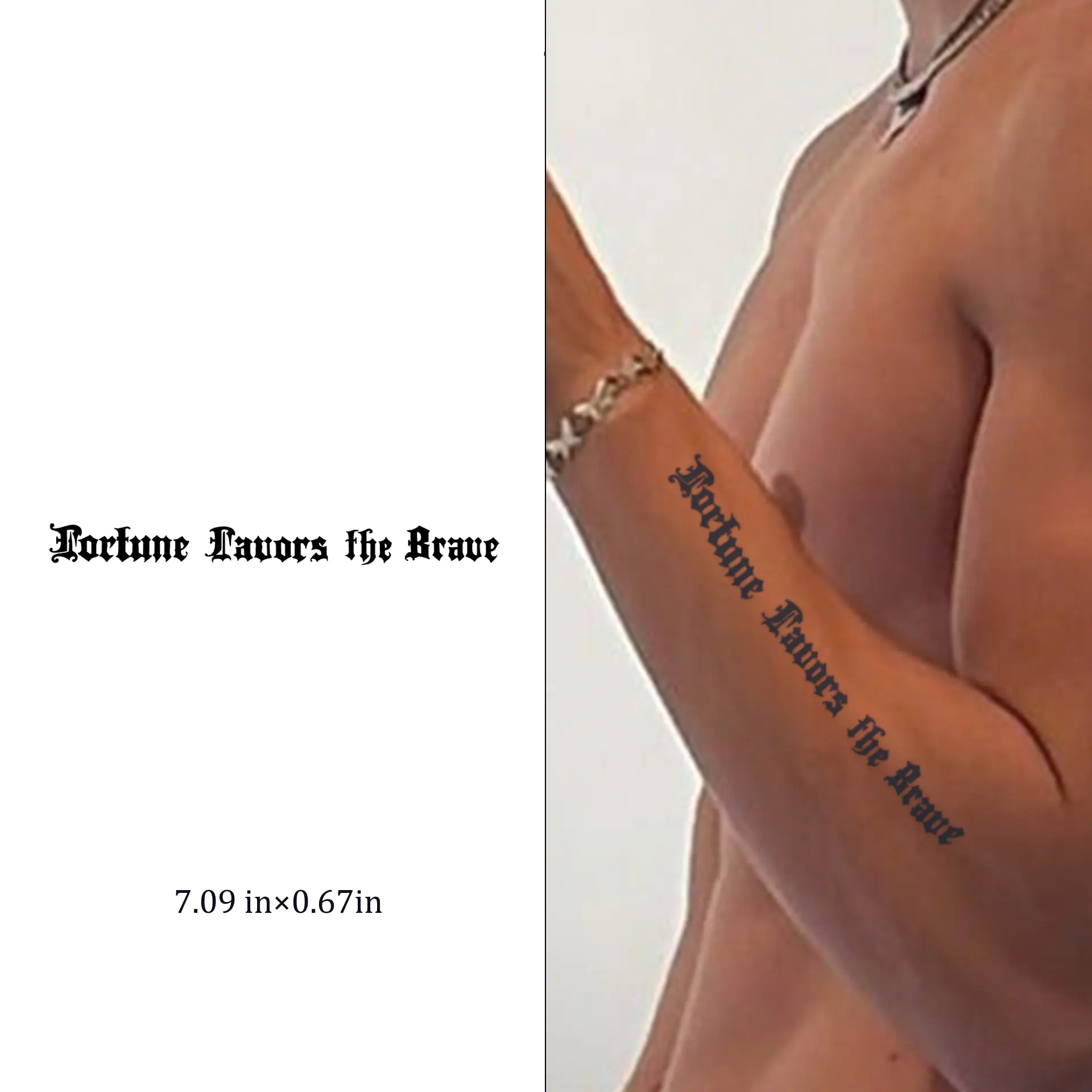 Showcase your courage with this “Fortune Favors the Brave” arm tattoo for men. Designed with bold, masculine lettering, this temporary tattoo creates a powerful statement on your forearm or bicep. The perfect tattoo arm man style for those who dare – easy to apply, lasts for days, and removes in seconds. Carry your mantra of bravery wherever you go.