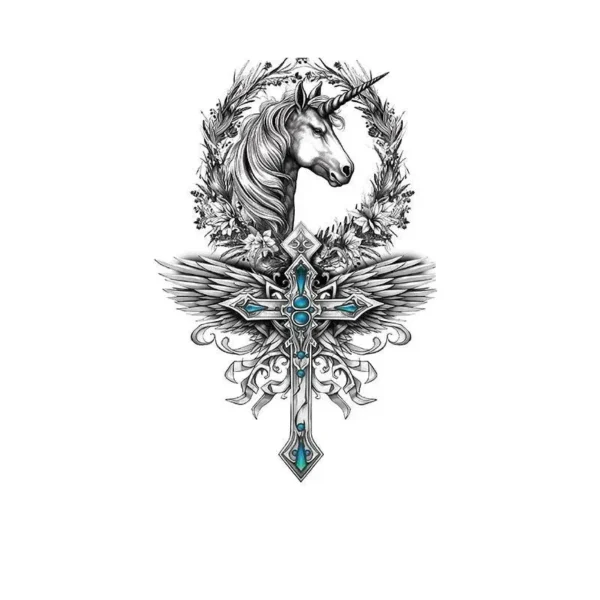 Unleash your mystical side with our Ethereal Unicorn Winged Cross Gothic temporary tattoo. This unique design blends celestial unicorns, delicate wings, and a gothic cross into a spellbinding piece of body art. Perfect for creating tattoo sleeves with a fantasy edge or adding a standalone statement piece to your collection.