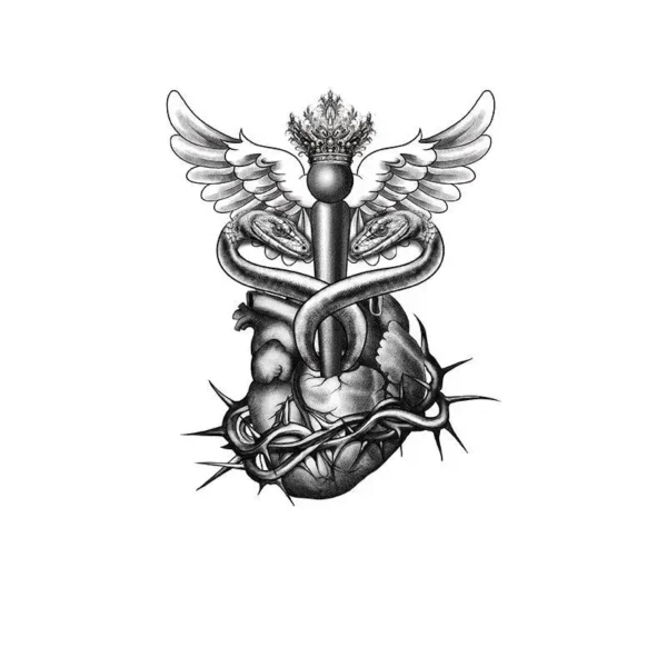 Unleash a blend of dark romance and mythic power with our Thorned Heart & Winged Serpent Gothic temporary tattoo. This intricate design merges the symbolism of a pierced heart with the guardianship of a serpent, offering a quintessential piece for those exploring dark tattoo styles. Experience the aesthetic of gothic and neo-traditional tattoo without permanence.